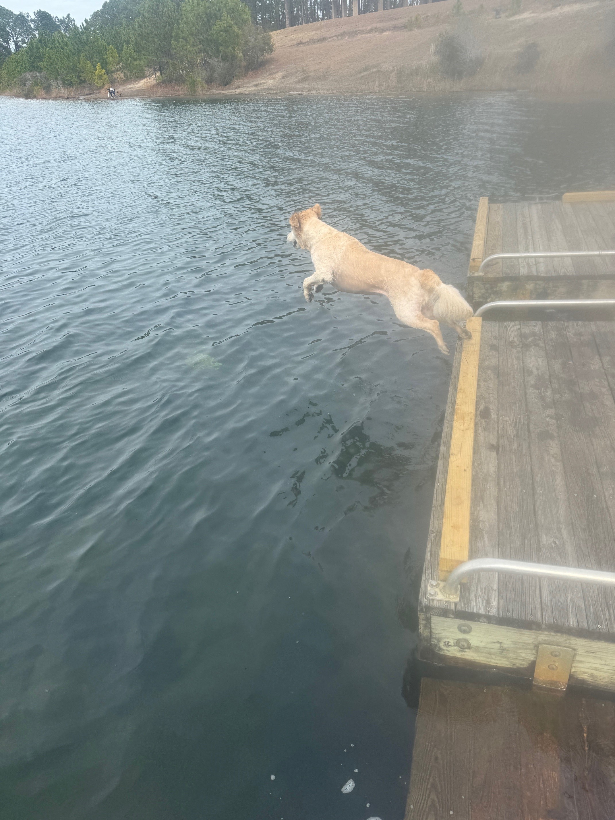 Then we biked around the paved trail back to the parking lot, where Gracie was patiently waiting in Janet’s vehicle. We took her down to the dock and took turns throwing tennis balls and sticks into the lake for her to jump from the dock and retrieve. A good time was had by all.