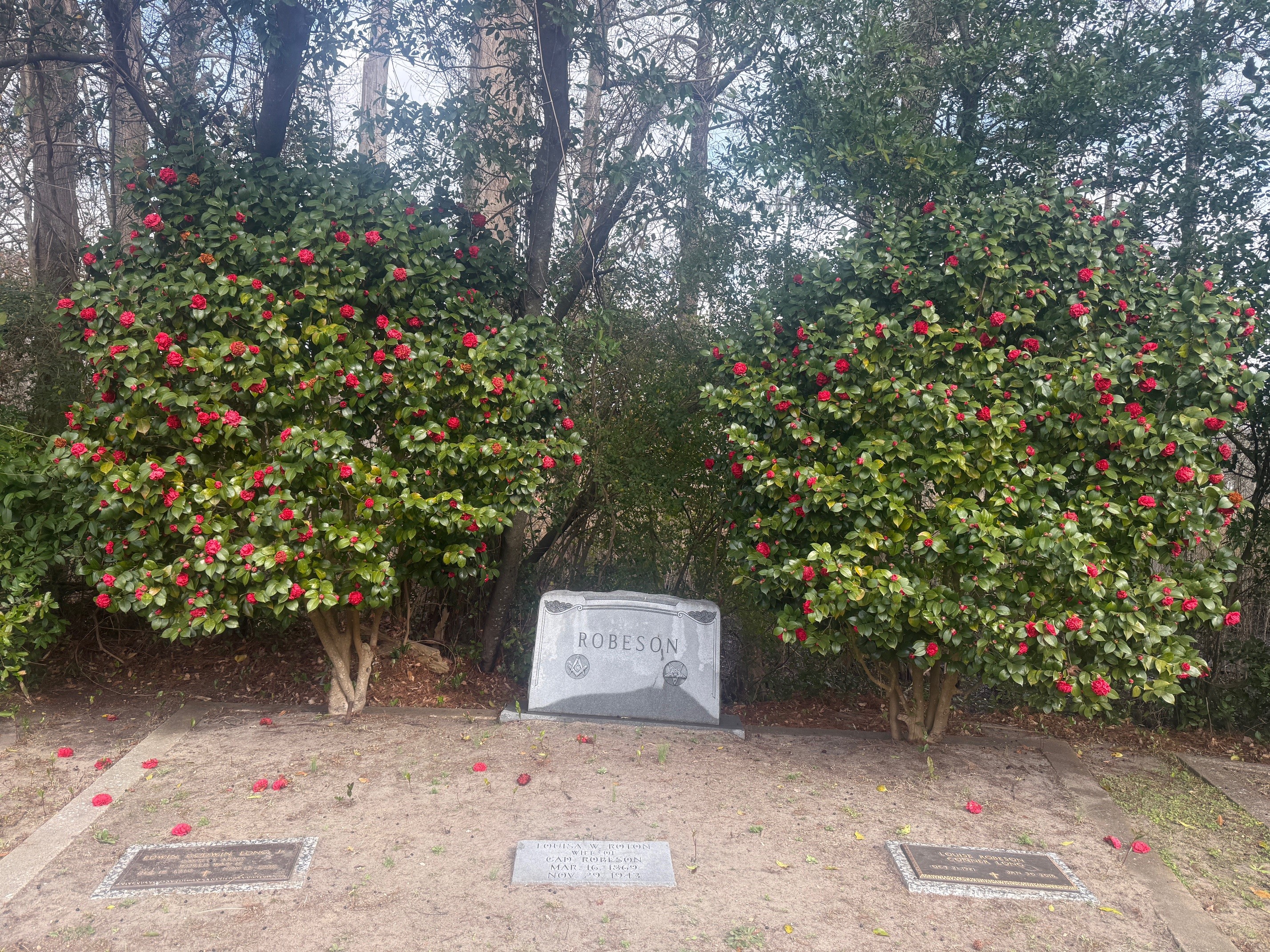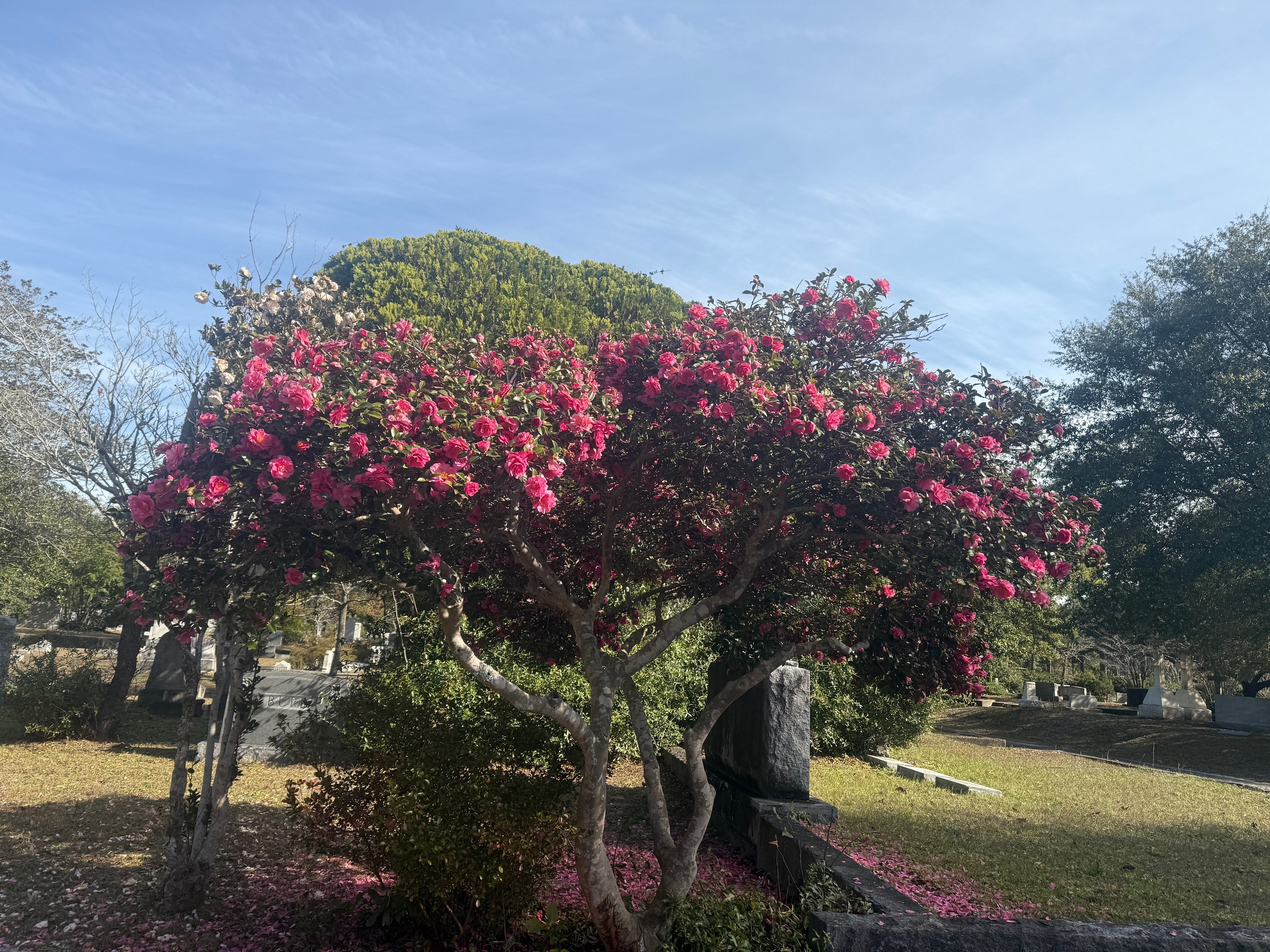 During many early morning trips to Oakdale Cemetery in our neighborhood by Bob, Janet and Gracie, we saw a nearly endless series of blossoming trees and bushes, mostly camelias which bloom all winter and into early spring.